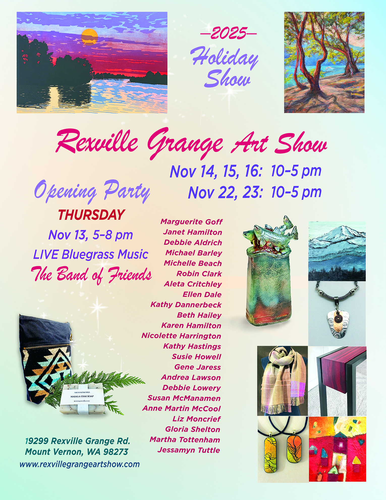 Welcome to the website for the Rexville Grange Art Show (previously known as the Pleasant Ridge Gallery at Rexville), an arts and crafts show held each year in the Skagit Valley of Washington State at the beginning of the holiday season. We feature paintings, pottery, glass, photography, jewelry, hats, clothing, weaving, and wood, all from local artists.