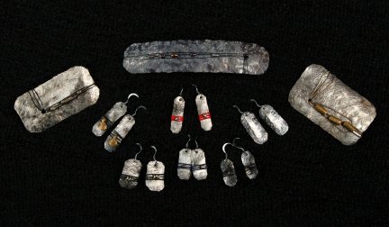 My scarves are hand-woven using rayon bouclé and chenille in colors that complement the fashion colors of the Northwest. In my current jewelry, I individually cut each metal element and hand-pound them for texture. The patina and embellishment of the pieces allow them to be unique.