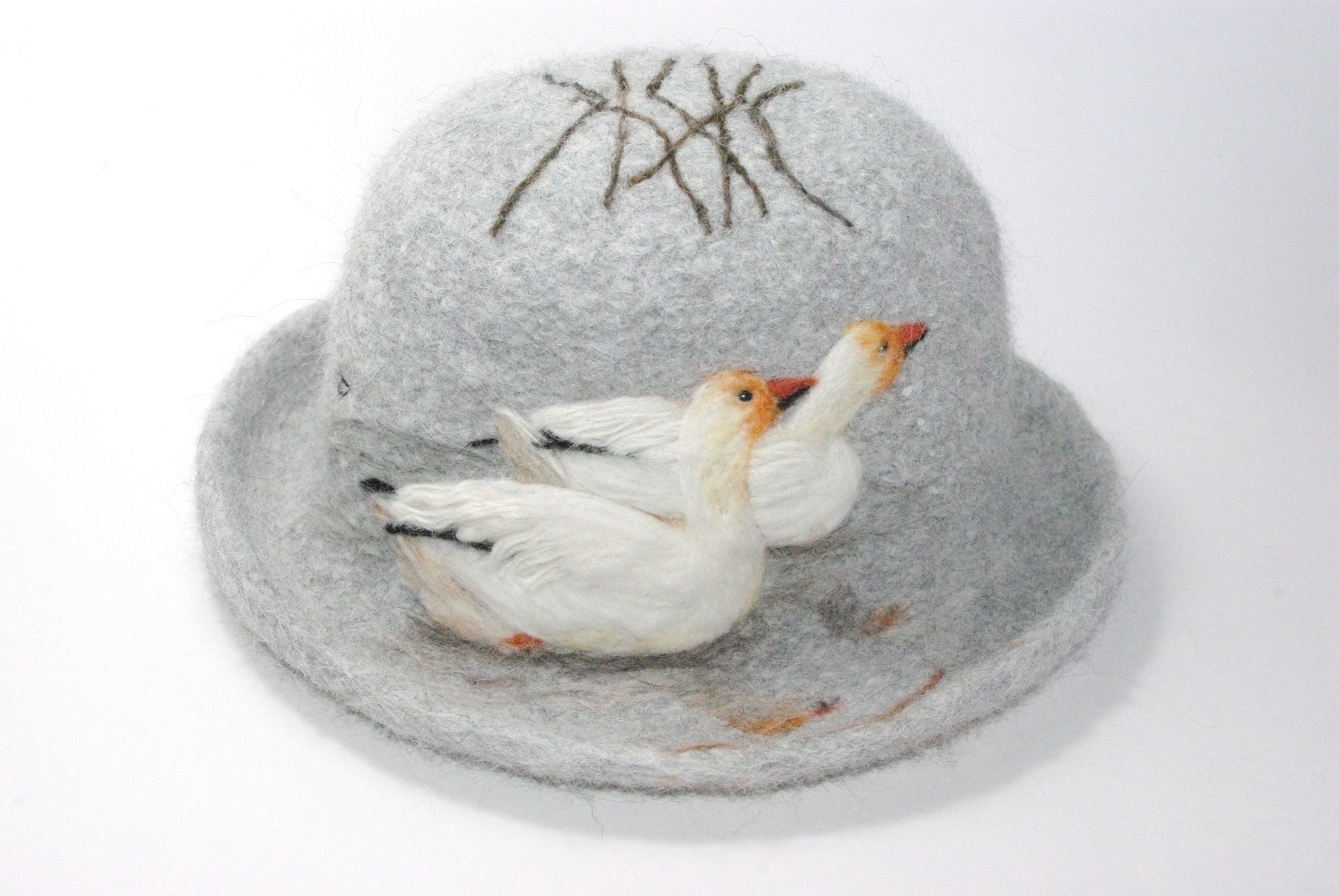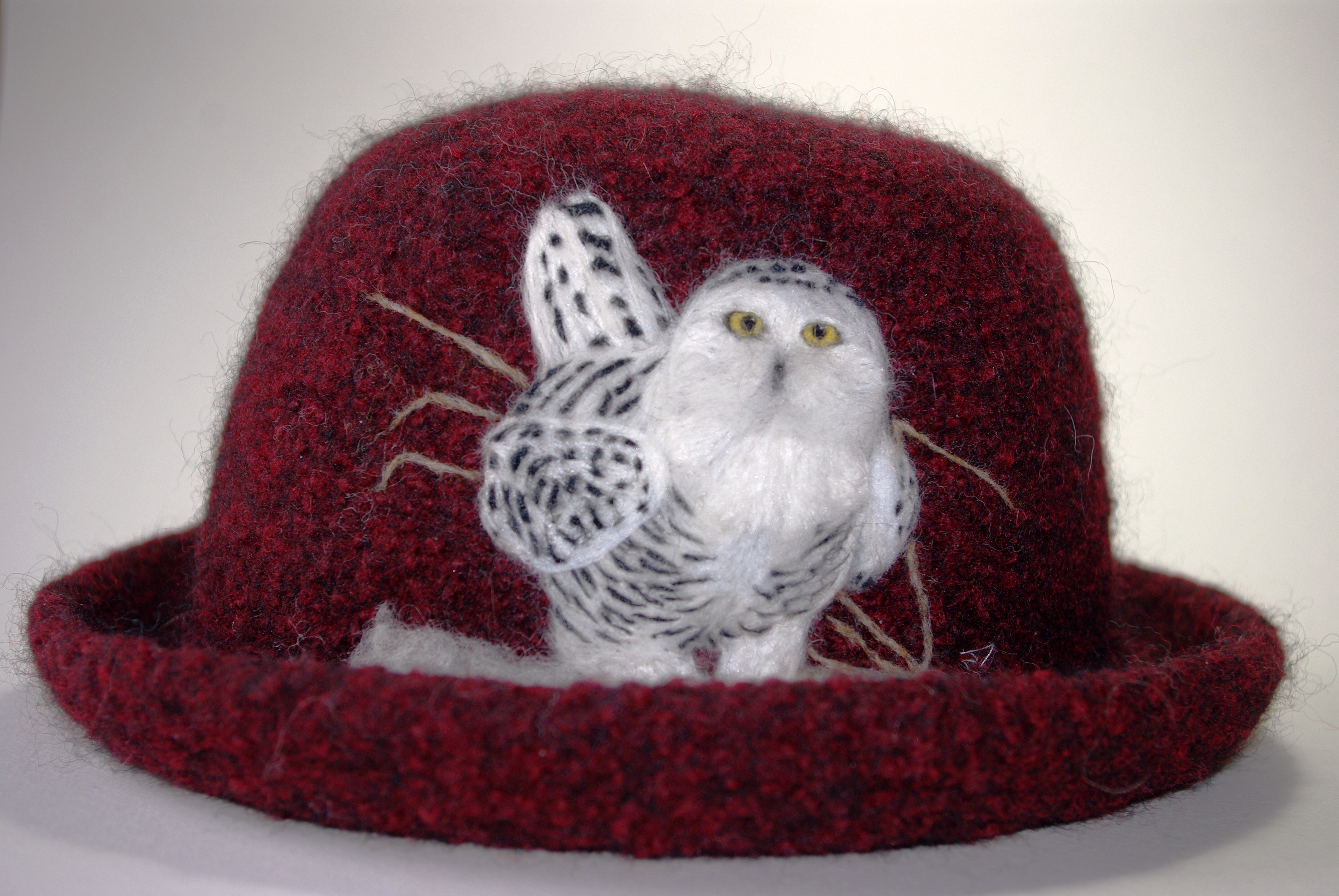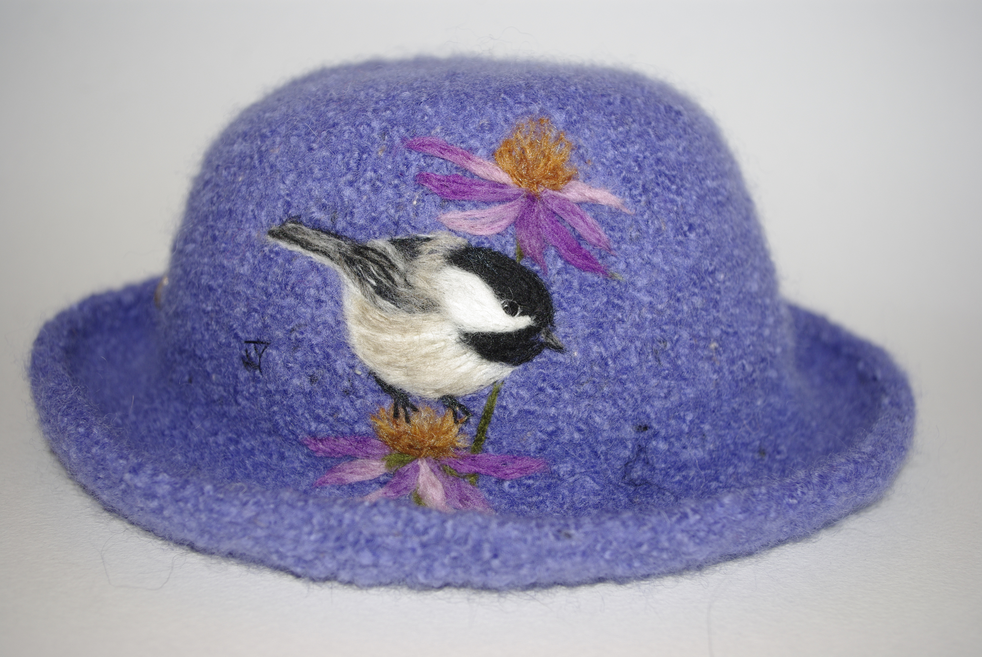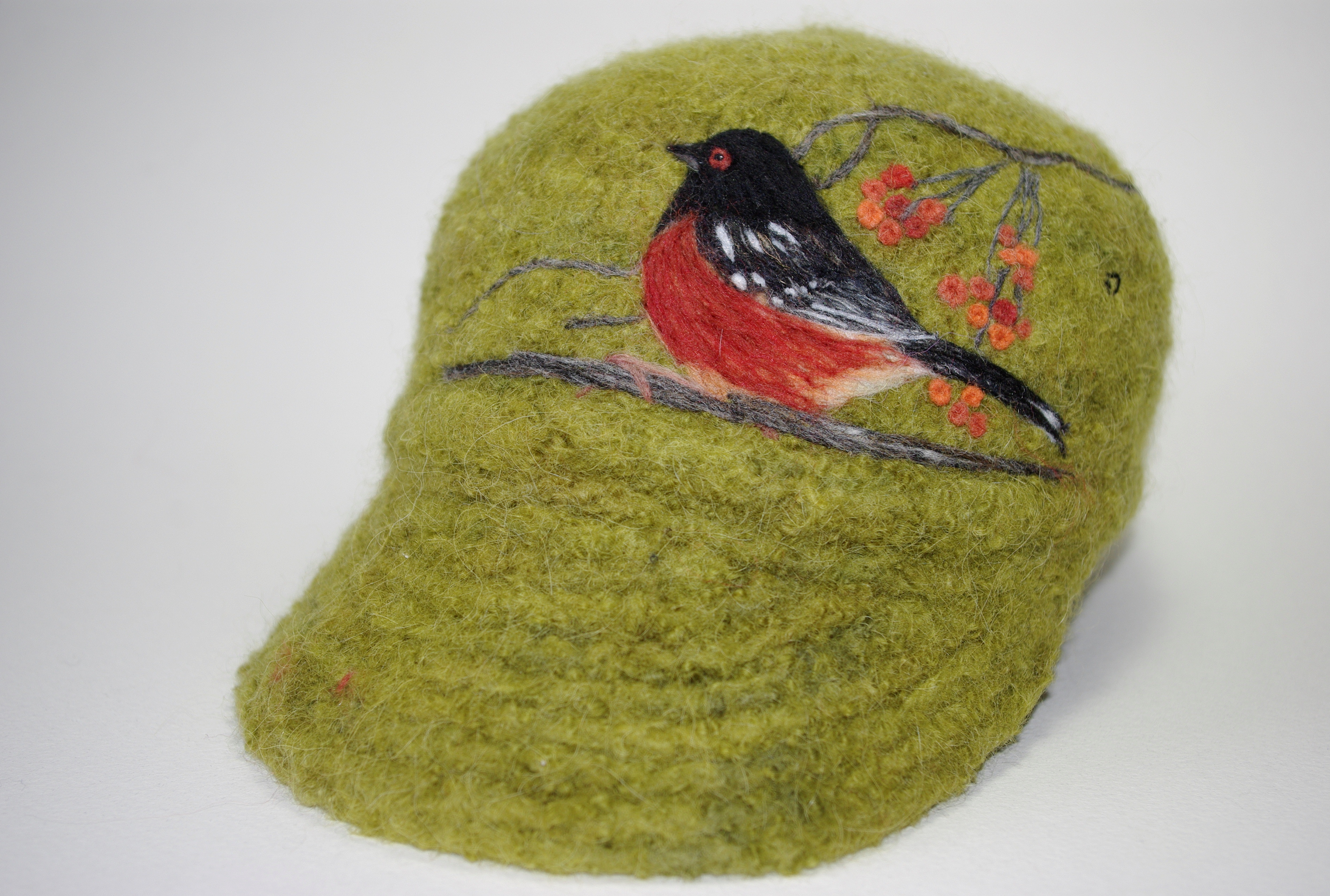 It is intriguing to take a single strand of yarn and twist it with two sticks to produce a fabric. And it is magical to put the fabric into the washing machine, turn it into felt and shape it into a hat. This is the canvas for illustrating the birds I encounter while hiking and those who visit me at Lake Martha. Using photographs for reference and a special needle that enables me to incorporate tiny pieces of yarn and wool into the hat, I create an image, one strand at a time. When finished, each hat is a unique, wearable piece of art and a reminder of a place I have been and a bird I have seen -Nancy Dean