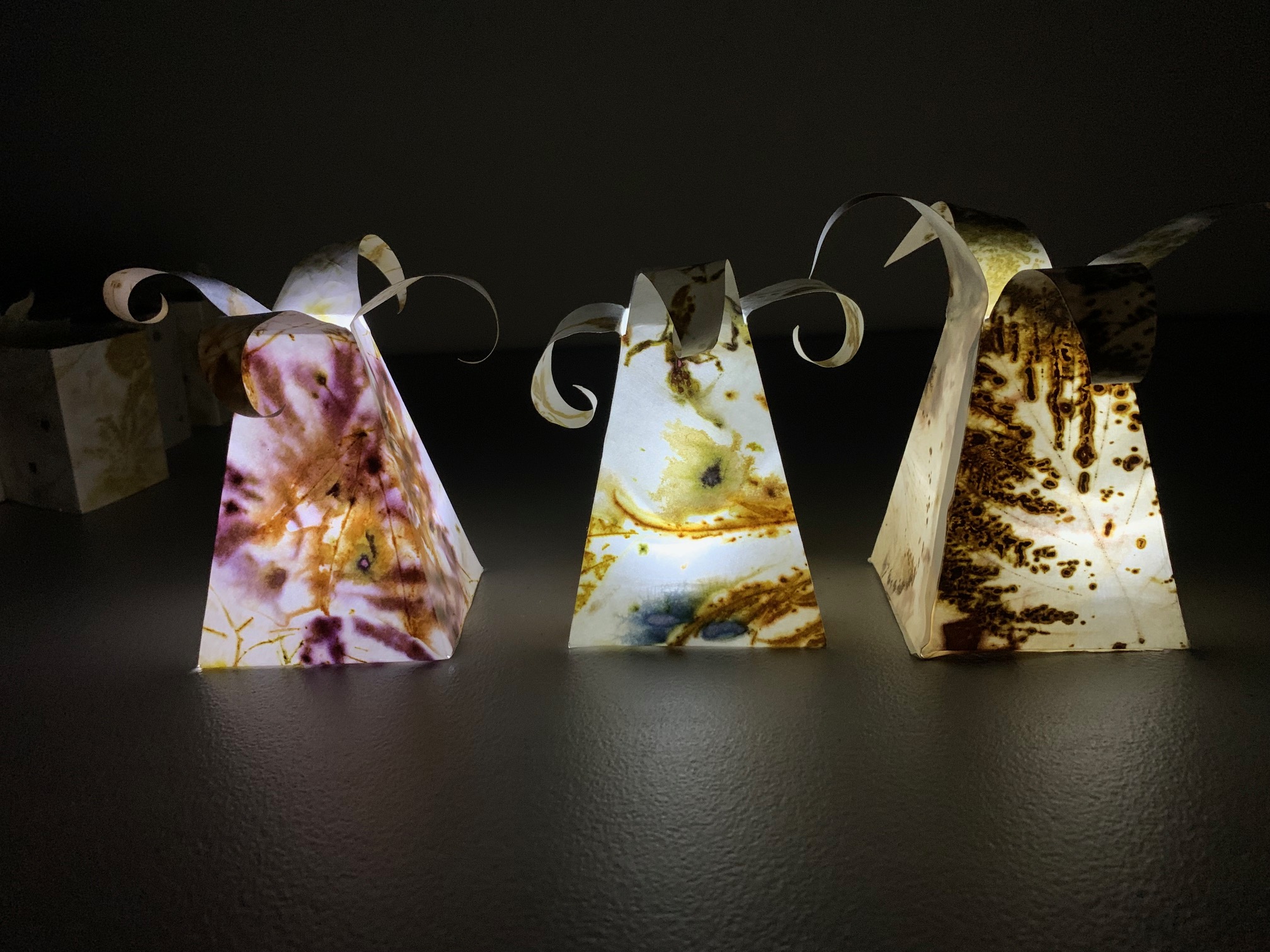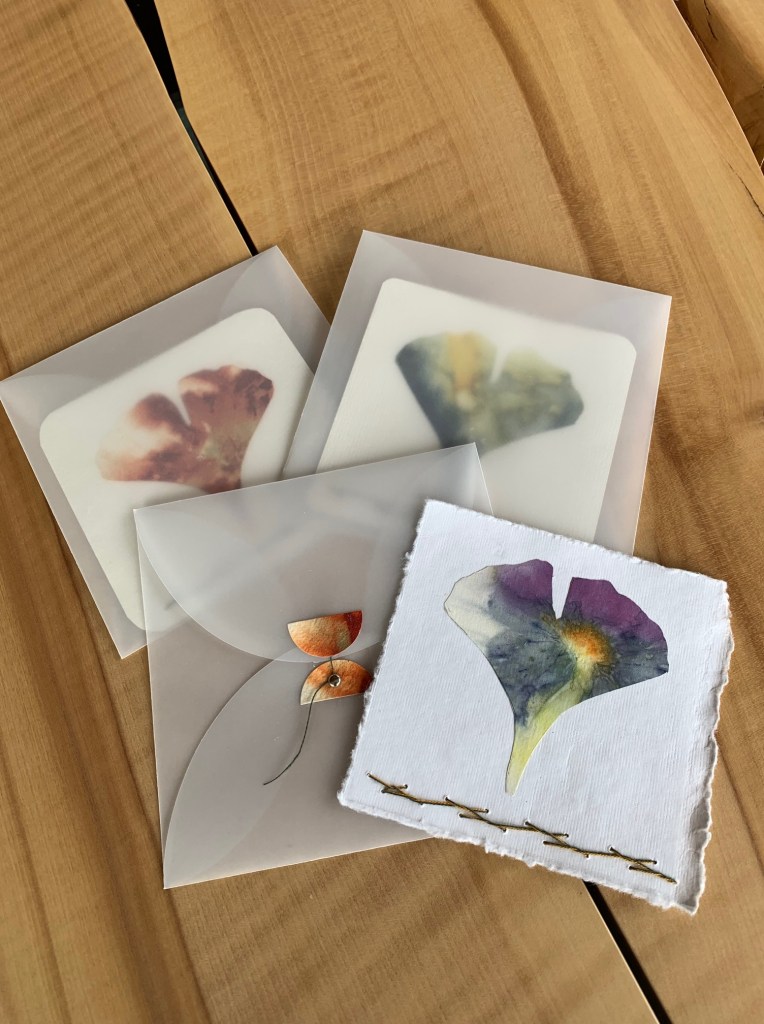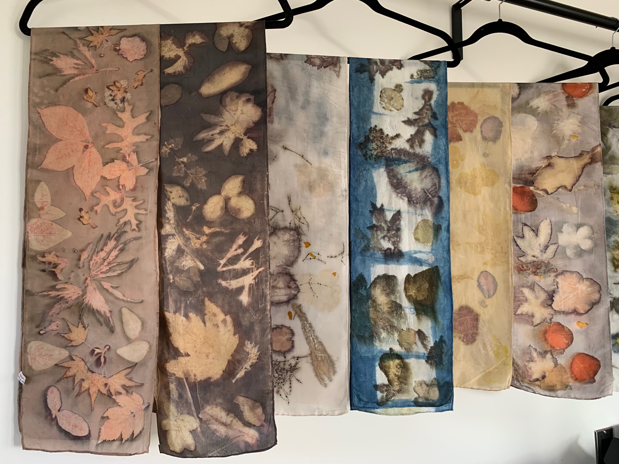 Our work is botanical printed fabrics including silk, cotton and linen and goods made with these eco printed fabrics such as scarves, table runners, and pillows. We also print various papers with botanicals and make items with these papers including cards, art cards, small lanterns, and gift tags.